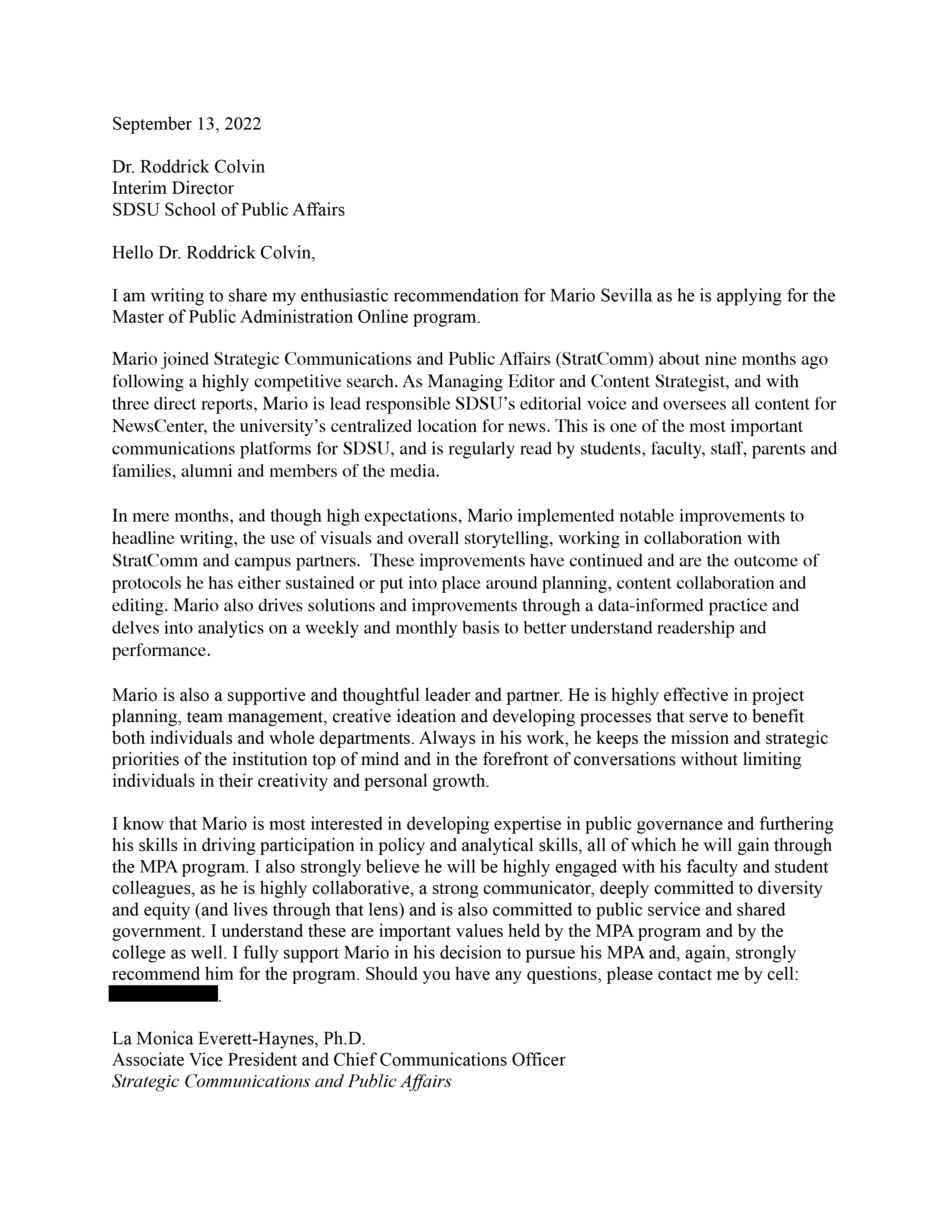 In mere months, and though high expectations, Mario implemented notable improvements to headline writing, the use of visuals and overall storytelling, working in collaboration with StratComm and campus partners. These improvements have continued and are the outcome of protocols he has either sustained or put into place around planning, content collaboration and editing. Mario also drives solutions and improvements through a data-informed practice and delves into analytics on a weekly and monthly basis to better understand readership and performance.Mario Sevilla served as SDSU’s Managing Editor and Content Strategist under La Monica Everett-Haynes, Ph.D.