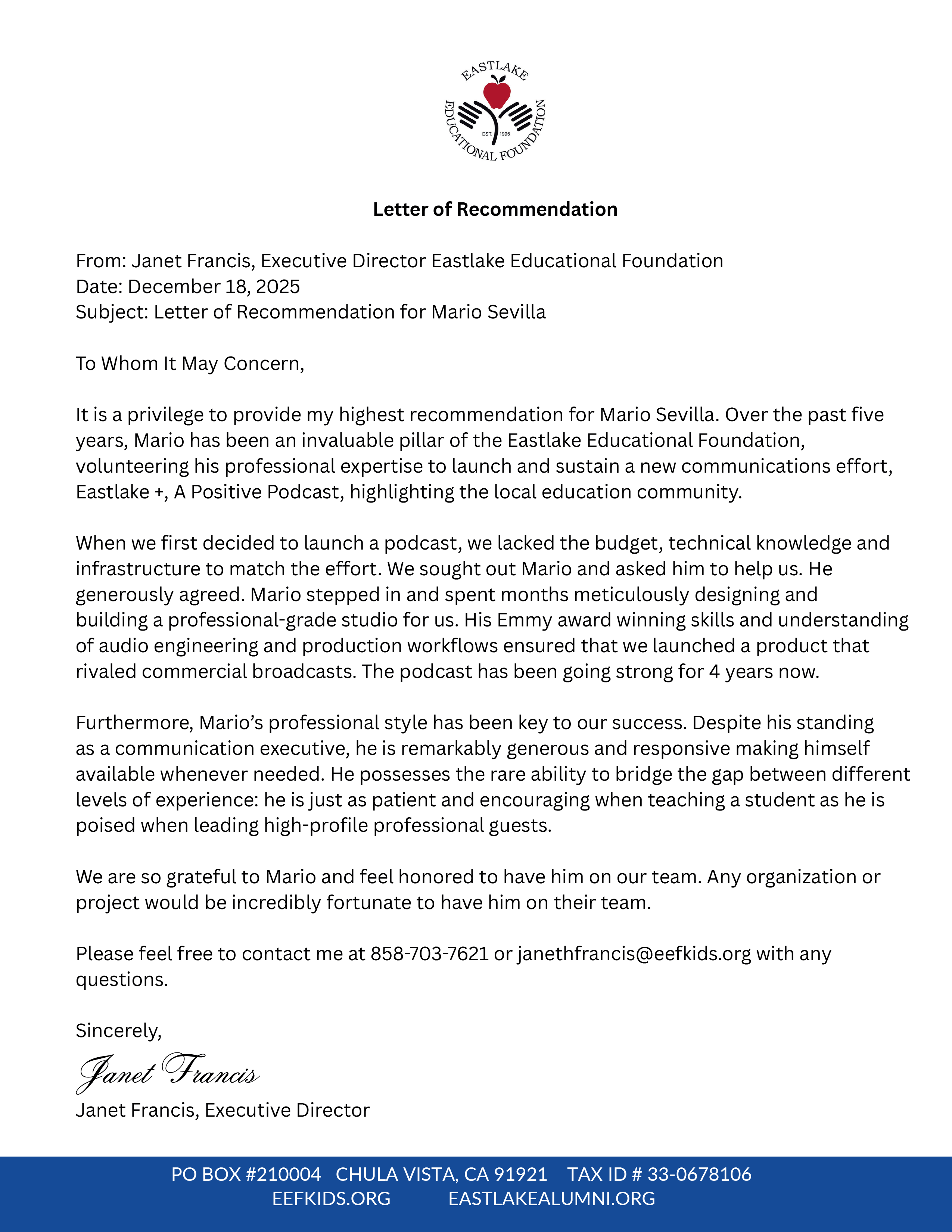 Mario Sevilla served as Volunteer Multimedia and Editorial Consultant, EastLake Educational Foundation